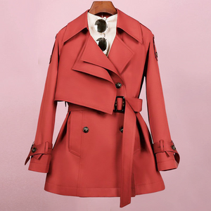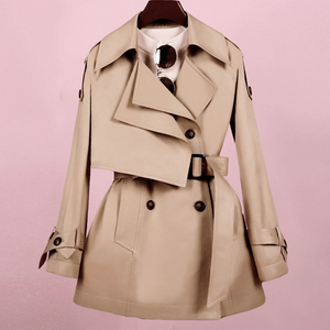 It showcases all signature details, including shoulder epaulets, a belted waistline, and a voluminous storm flap.