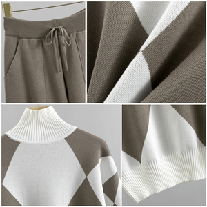 The sweater showcases a bold diamond pattern, displaying a masterful interplay of meticulously woven threads.