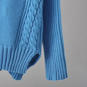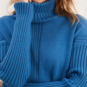 The roll-neck sweater showcases an artful composition, featuring a delicate blend of cable knits and fisherman's rib stitches.