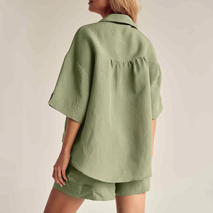 Meticulously crafted to deliver a harmonious blend of comfort and style, the ensemble consists of a matching blouse and shorts.