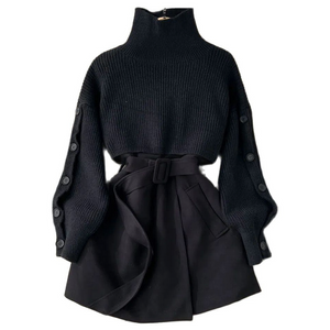 A springtime combo that includes a knitted sweater and an elegant vest dress.