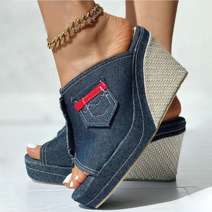 Imagined in a dark wash indigo denim upper, the mules boast a sleek open-toe profile and are elevated by a chunky wedge sole.