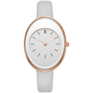 The timepiece showcases an everlasting quartz mechanism nestled beneath a minimalist oval dial.