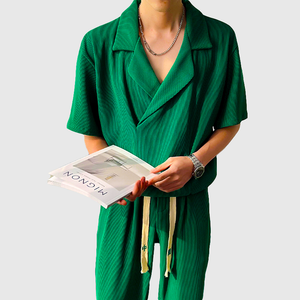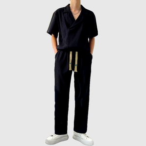 A sophisticated ensemble is achieved by a short-sleeved shirt with a luxe waffle wrap collar combined with a pair of loose-fitting pants.