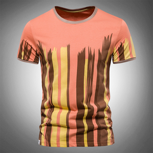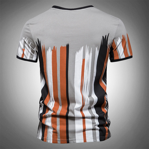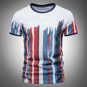 Punctuated by multicolored vertical stripes and tonal lining for a dynamic take on the classic tee design.