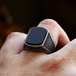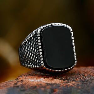 The Raven Midnight Steel Ring is one of our most exclusive rings, featuring a striking black onyx stone nestled within a sleek stainless steel band.