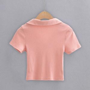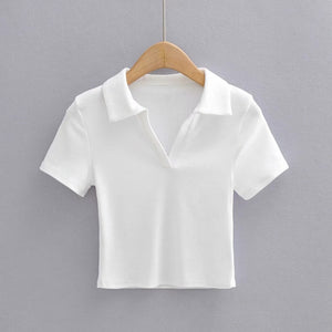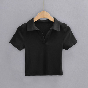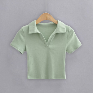 Knitted with soft fine ribs, the compact tee features a low-cut V neckline, short sleeves, and an open collar polo.