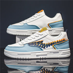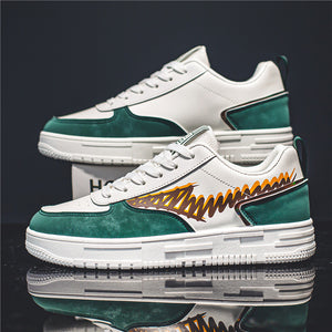 The pair is detailed with contrasting textile panels and graphic prints along the upper for an edgy, layered look.