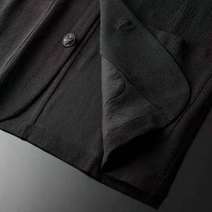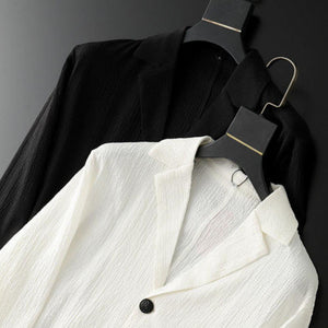 A sophisticated ensemble is achieved by a long-sleeved blazer with a crisp notched collar combined with a pair of loose-fitting pants.