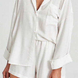 Designed with a relaxed fit, the ensemble includes an oversized blouse and coordinating shorts.