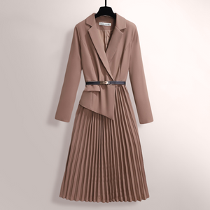 The longline section of the iteration is adorned with fine pleats and folds, adding a refined touch to its tailored finish.