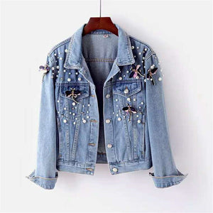 Luminous pearl beads adorn the upper section, creating a stunning contrast against the rugged denim construction.