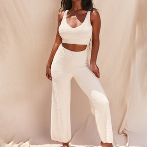 The top boasts a delicate V-neckline and ribbed detailing, while the matching pants feature an elastic waistline and a wide-leg design.