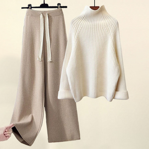 The pullover boasts a cozy turtleneck, while the flowy pants are topped with an elastic waistband, ensuring a snug fit.