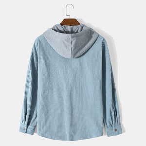 The Arius Casual Hooded Corduroy Shirt in blue has been designed in a utilitarian style with a relaxed fit, long sleeves, and a practical chest pocket.