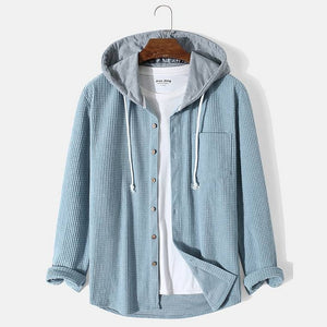 Made of durable corduroy with a distinct waffle weave, it features a smart button fastening, cuffed sleeves, and a contrasting hood.