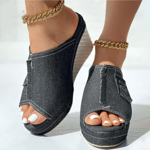 Imagined in a dark wash indigo denim upper, the mules boast a sleek open-toe profile and are elevated by a chunky wedge sole.