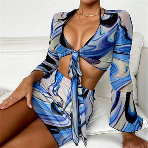 Featuring an intricate swirl pattern, this stylish ensemble adds an element of artistry to any beach look.