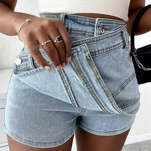 Cut from stretch-infused denim, it features an asymmetrical wrap-style skirt at the front paired with a shorts-like structure at the back.